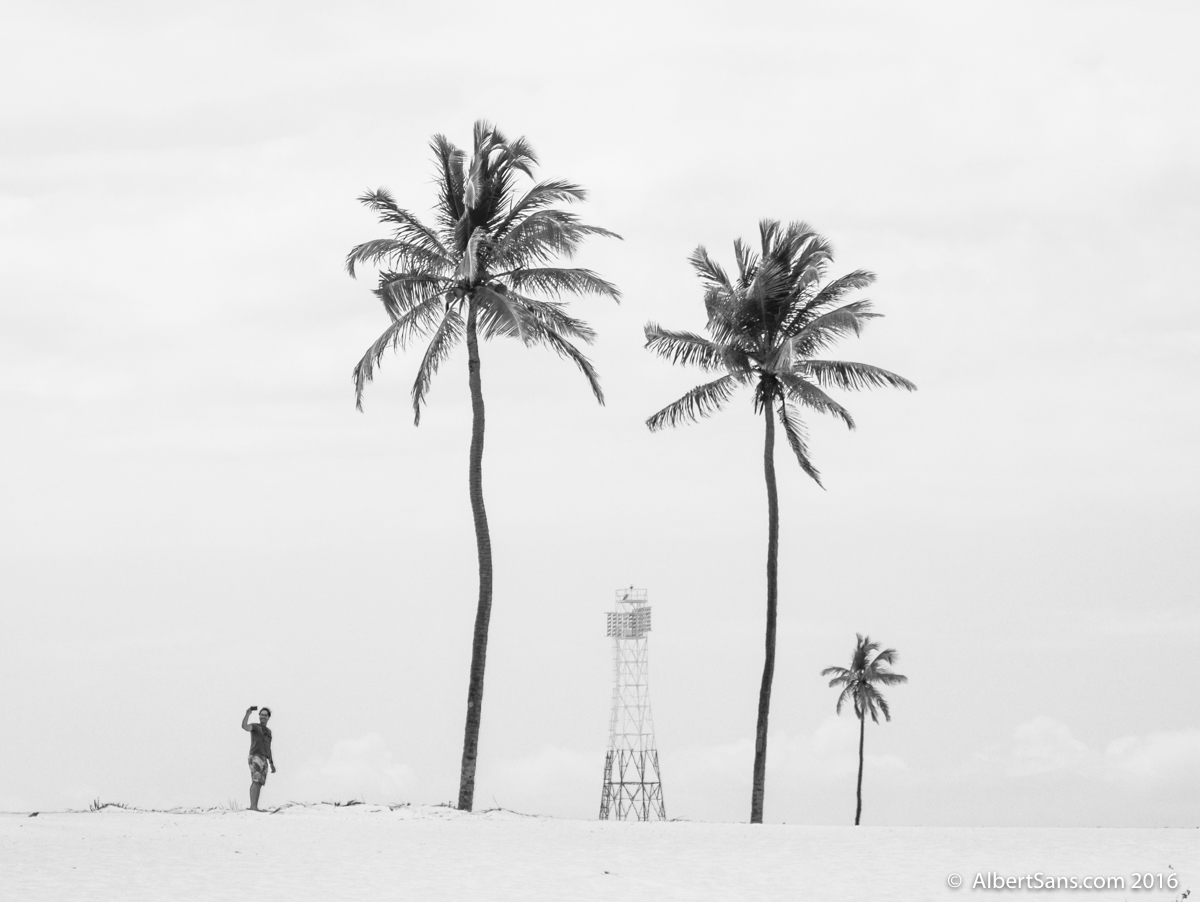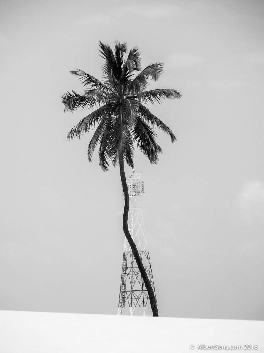 Los aislados y delgados cocoteros y una torre metálica parecen modelos escuálidas posando para revistas de moda.
