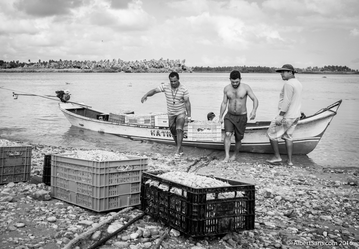 En una orilla al límite del pueblo llegan las barcas a un caótico puerto para descargar cajas rebosantes de materia prima.
