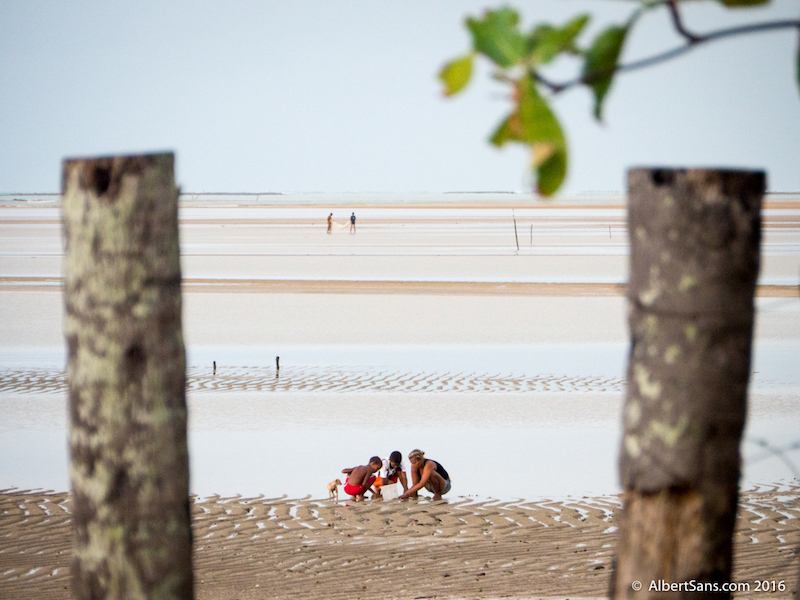 Me vuelvo con una sonrisa de éxito al pueblo. Cruzo las largas pasarelas de tablones de madera que saltan el rio y los manglares hasta la callejuela que lleva hasta la placita. Es un pueblo muy pequeño, si vas por la carretera apenas percibes 4 casas a un lado ya otro camino del famoso Sao Miguel dos Milagres, pero su secreto esta en escondido en agua dulce, en los arrecifes, en la playa calmada en la que familias buscan cangrejos y pequeños crustáceos, en los cangrejos colorados del manglar, en la sabiduría de los pescadores, las salidas y las puestas de sol, en los partidos de futbol en el campo cerca del manglar, en el Manatí y en definitiva en esas sonrisas que regala Brasil en cada rincón de su pueblo.