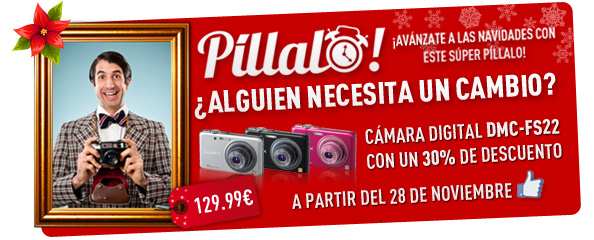 ¿Estabas esperando un nuevo Píllalo? Pues ha llegado el momento porque aquí estamos otra vez, para que puedas aprovecharte de una promoción a precios de escándalo. Y esta vez te ofrecemos una de nuestras fantásticas cámaras Lumix, la FS22, a un precio sin igual: ¡sólo 129,99€!