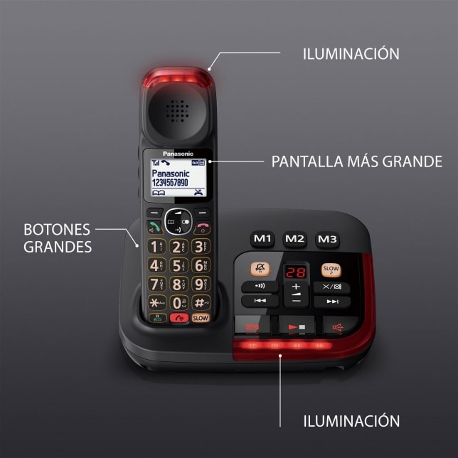 Teléfono inalámbrico digital con contestador automático, volumen alto (más de 40 dB), modo de voz lenta, control del tono detallado, botones grandes fáciles de usar, función de asistencia de voz, funciones de bloqueo de llamadas y compatibilidad con audífonos. Produce luces cuando suena, y dispone de un botón «Favorito» e identificación de llamadas de voz.